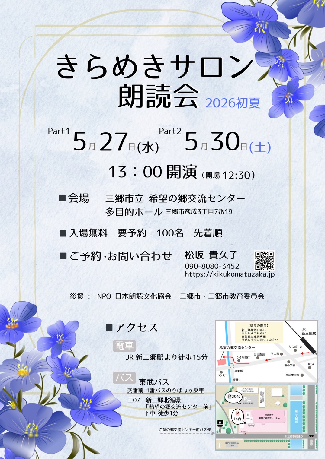 日時 :2024年10月28日 14:00~ 会場 :西宮市 中村邸 朗読者:阿部俐奈、岩瀬弥永子 プログラム:現代詩「スクールゾーン」「おんなのことば」より、 「三屋矢清左衛門残日録」、「吾輩は猫である」「文学作品の中の漢詩」 漢詩は中国語の朗読も。古筝と蓮花鼓の音とともに 連絡先:阿部俐奈 09 […]